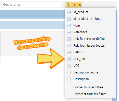 Exemple : Votre boutique est connectée à un ERP qui a sa propre référence interne pour les produits. Votre agence a ajouté un champ REF_INT aux fiches produits PrestaShop pour faire la liaison entre votre boutique et votre ERP.