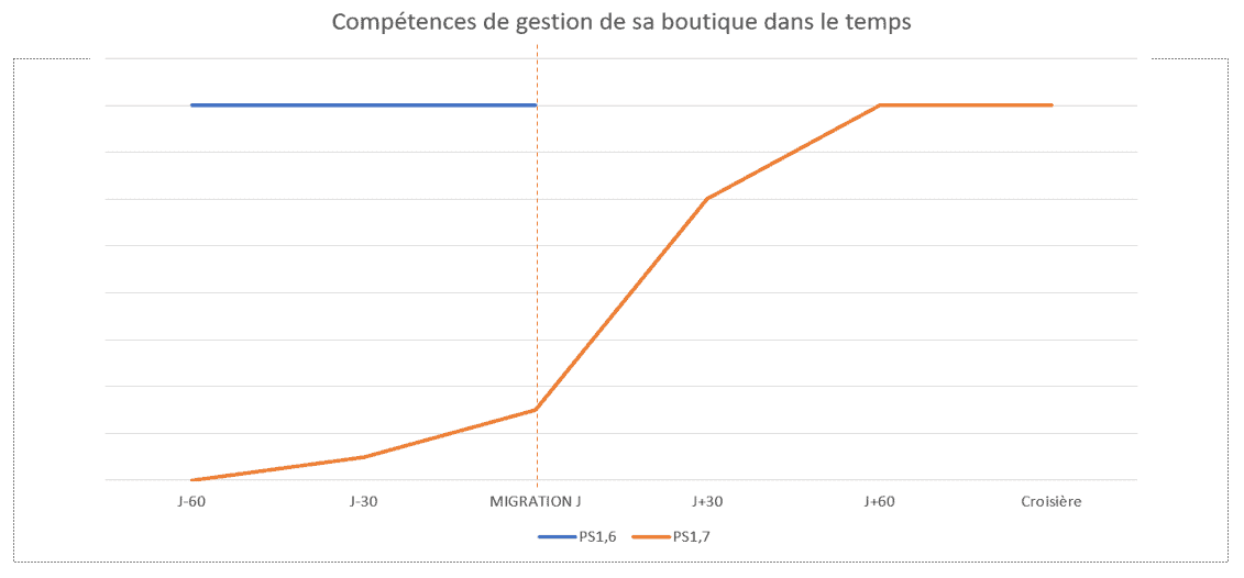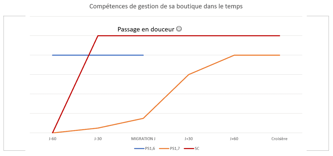 Comment répondre rapidement et de manière exhaustive à son client quand on ne maîtrise pas son outil de travail ? La méthode la plus efficace pour apprendre à se servir de PrestaShop, c’est encore de l’utiliser. Voici une représentation graphique du niveau de compétence d’un marchand avant, pendant et après sa migration.