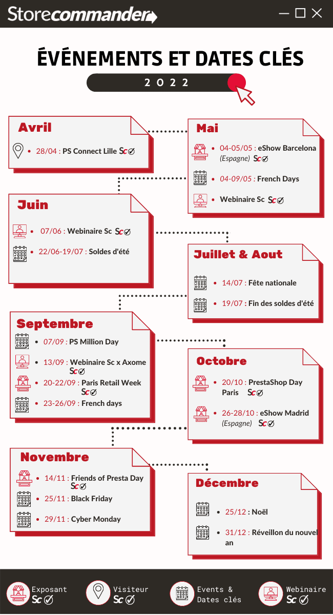 Pour la seconde année consécutive, nous avons souhaité vous faciliter la vie en vous concoctant une liste des dates clés 2022 du e-commerce à ne surtout pas manquer. Dans cette liste, vous trouverez à la fois les différents salons auxquels la team Store Commander sera présente comme exposant ou visiteur, nos webinaires et également les grands temps forts du secteur.