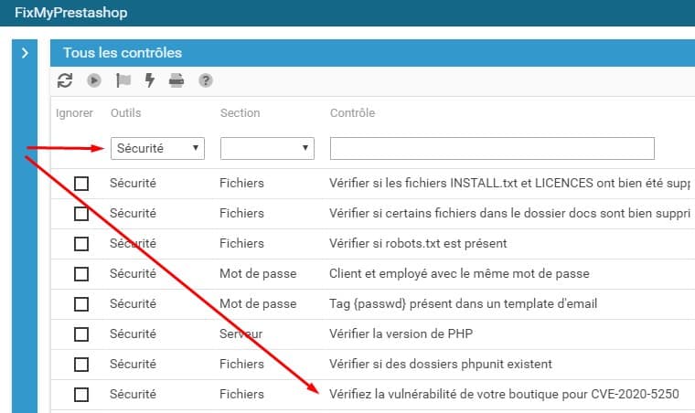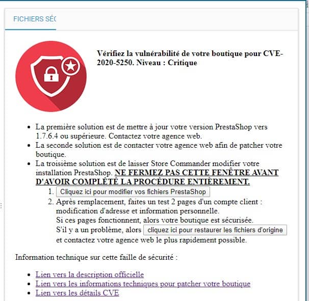 et le contrôle Outils:Sécurité > "Vérifiez la vulnérabilité de votre boutique pour CVE-2020-5250" que vous voyez sur cette capture :
